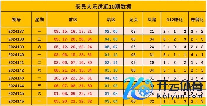 大乐透2024146期开奖奖号:前区05,20,21,22,32,后区03,04,前区号码龙头05,凤尾32。012路比1:1:3。奇