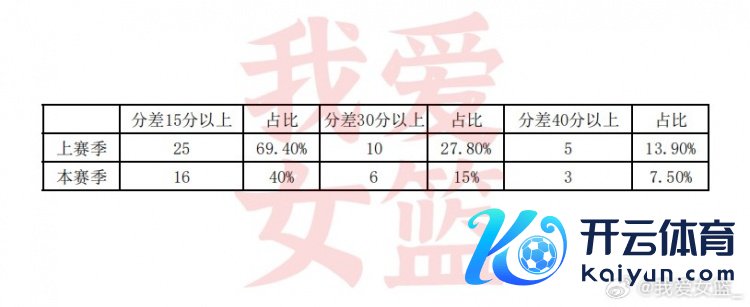 我爱女篮对比了上赛季老例赛前4轮(共36场)的数据,发现本赛季分差15分以上的比赛,仅占比40%,而上赛季占比为69.4%;本赛季分差30分以上的比赛,占比从27.8%缩短到了15%;分差40分以上的比赛,则从13.9%降到了7.5%。不错看到,这3个分差区间内的比赛,本赛季减少了40%还要多。要是分差减轻意味着精彩浓烈历程提高,那么咱们不错说,本赛季的精彩浓烈历程提高了40%以上。